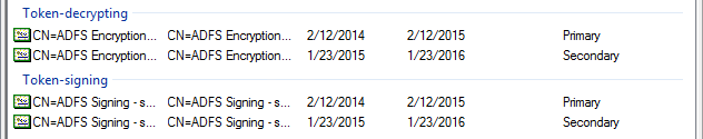 In the screenshot below, we can see our primary certificates expire on 2/12/2015 and ADFS has already created new certificates to rollover. The new (secondary) certificates were created 20 days prior to the expiration of the primary certificates (1/23/2015). On 1/28/2015, 5 days after the creation of the new certificates, ADFS will change them to primaries.