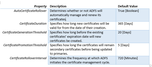 There are a number of settings for ADFS only accessible via PowerShell that control the Auto Certificate Rollover options and properties for the process above. To access these, open an administrative PowerShell prompt and execute the following (Note that if you are using ADFS 2.0, you will need to add the ADFS PowerShell Snap-In first by executing Add-PSSnapin Microsoft.ADFS.PowerShell):
